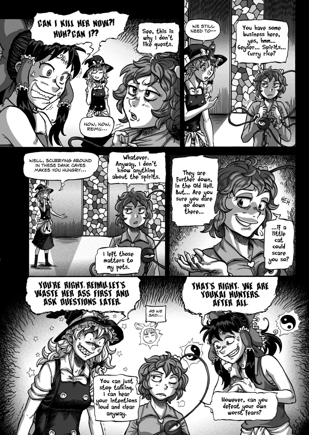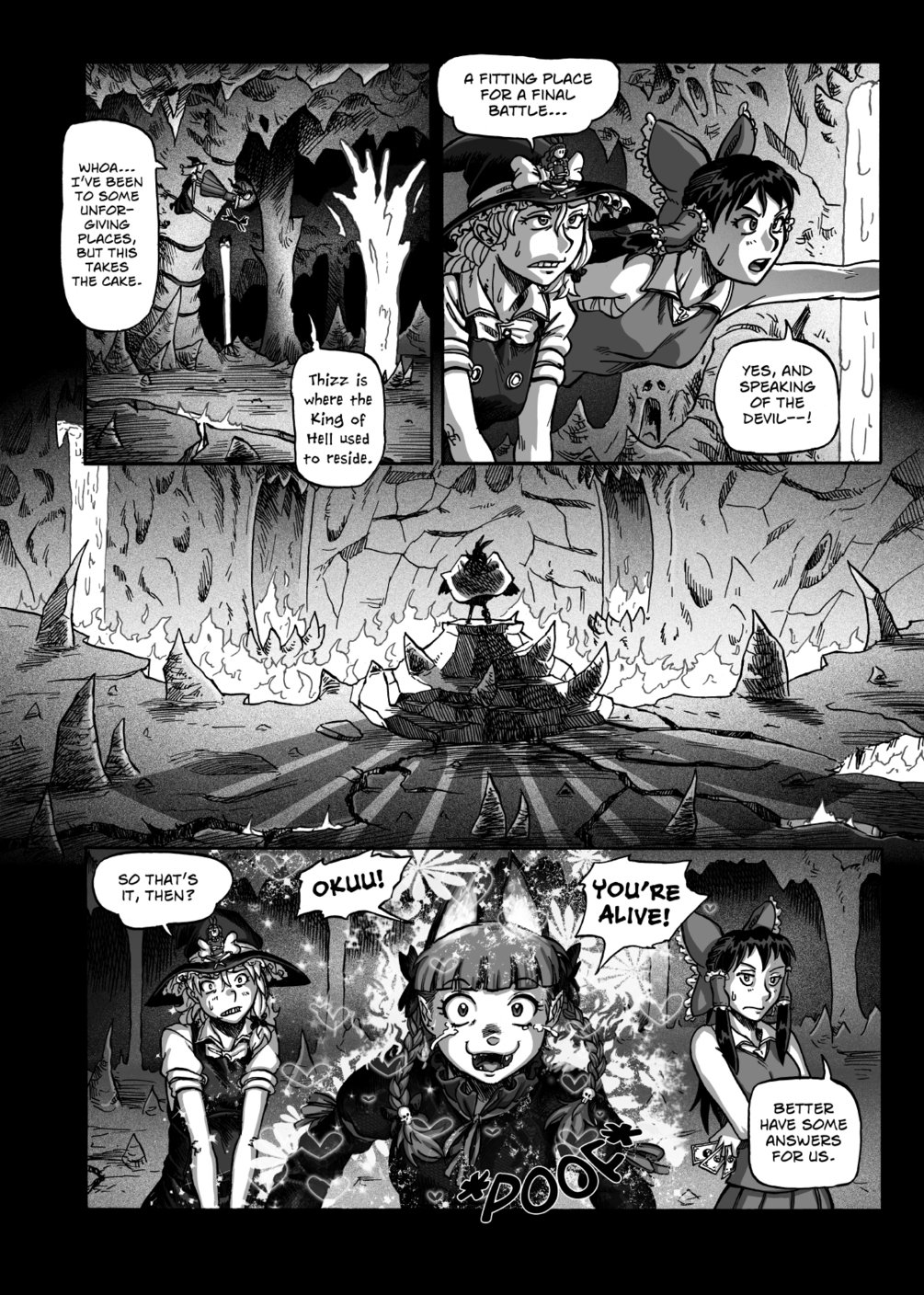 An "arrange comic", in which I present an alternative retelling of the events in Touhou Chireiden ~ Subterranean Animism. Reimu and Marisa go together down into the underworld with the whole cadre of youkai helpers at their back on the surface. A continuation of Parsee's story from RGB, this starts at stage 4, and goes all the way down to the blazing hells.